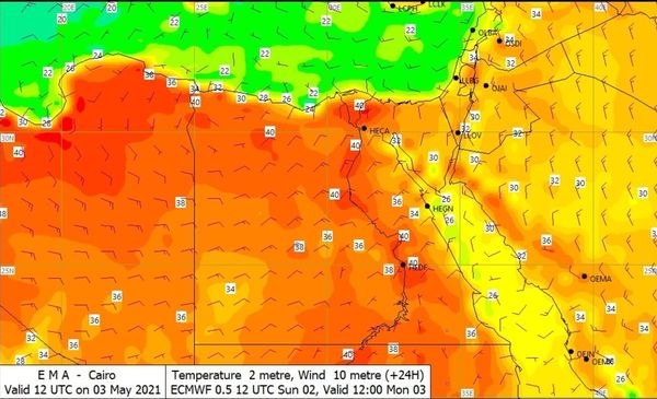 وقالت هيئة الأرصاد الجوية، إنه من المتوقع أن الموجة الحارة تبدأ تدريجيا من اليوم الاثنين حيث تسجل الحرارة 39 درجة نهارا على القاهرة، وليلا 22 درجة، وتكون ذروة هذه الموجة يوم الأربعاء، فتسجل الحرارة على القاهرة 41 درجة خلال ساعات النهار، وليلا تسجل 23 درجة.