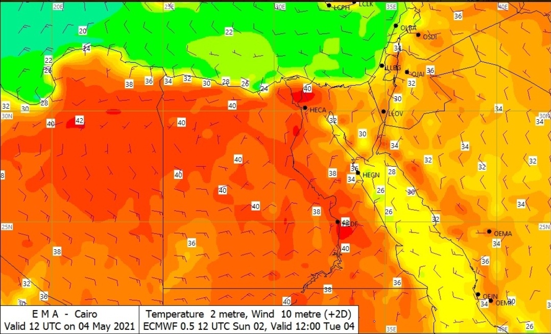 نشرت هيئة الأرصاد الجوية، صورا لخرائط توزيعات الضغط الجوي ترصد، كتلة هوائية شديدة الحرارة تهب على البلاد من الاتجاه الشرقي، يرافقها مرتفع جوي في طبقات الجوي العليا، يتسبب في ارتفاع معدل درجات الحرارة على كافة محافظات الجمهورية.