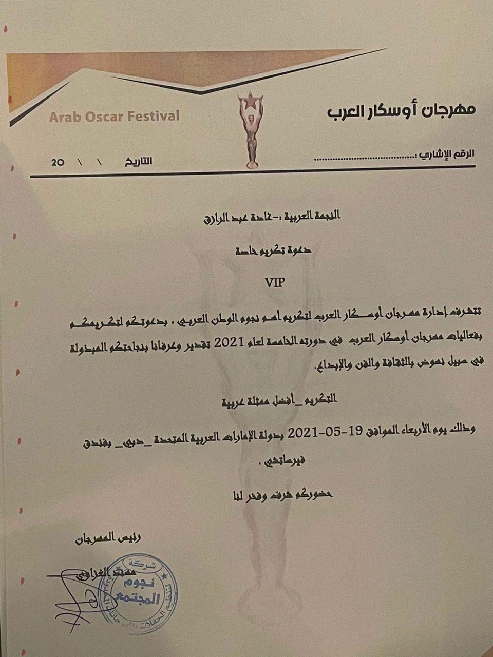 تكرم النجمة غاده عبد الرازق كأفضل ممثلة عربية هذا العام من جانب مهرجان أوسكار العرب والذي ستقام فاعلياته بدبي يوم ال١٩ من شهر مايو الجارى.