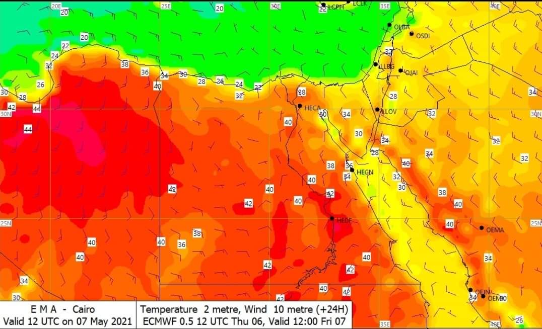 وحول درجات الحرارة المتوقعة، غدا الثلاثاء، على القاهرة الكبرى والوجه البحري 33 للعظمى والصغرى 19، السواحل الشمالية 26 للعظمى والصغرى 17، جنوب سيناء وسلاسل جبال البحر الأحمر 36 للعظمى والصغرى 25، شمال الصعيد 35 للعظمى والصغرى 21 للصغرى، جنوب الصعيد 43 للعظمى والصغرى 26.