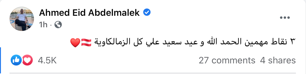 وكتب احمد عيد عبد الملك عبر حسابه بموقع التواصل الاجتماعي فيسبوك : ٣ نقاط مهمين الحمد الله و عيد سعيد علي كل الزمالكاوية .