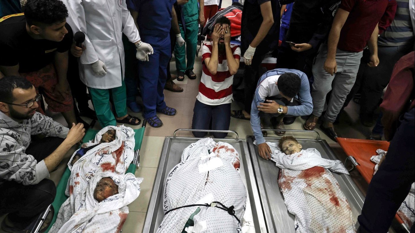 مشهد مروع تظهر جثث الأطفال مسجاة على الأرض، ملفوفة بكفن أبيض وينكفى عليها الجد منتحباً باكيا بشدة لفقده أعز ما لديه في لحظات في مشهد لا يمكن وصفه بكلمات .