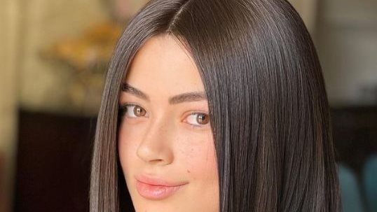 كما تركت شعرها البني الطويل منسدلا بين كتفيها بطريقة بسيطة، ورفعت خصلات ناعمة من شعرها لتبرز جمالها.