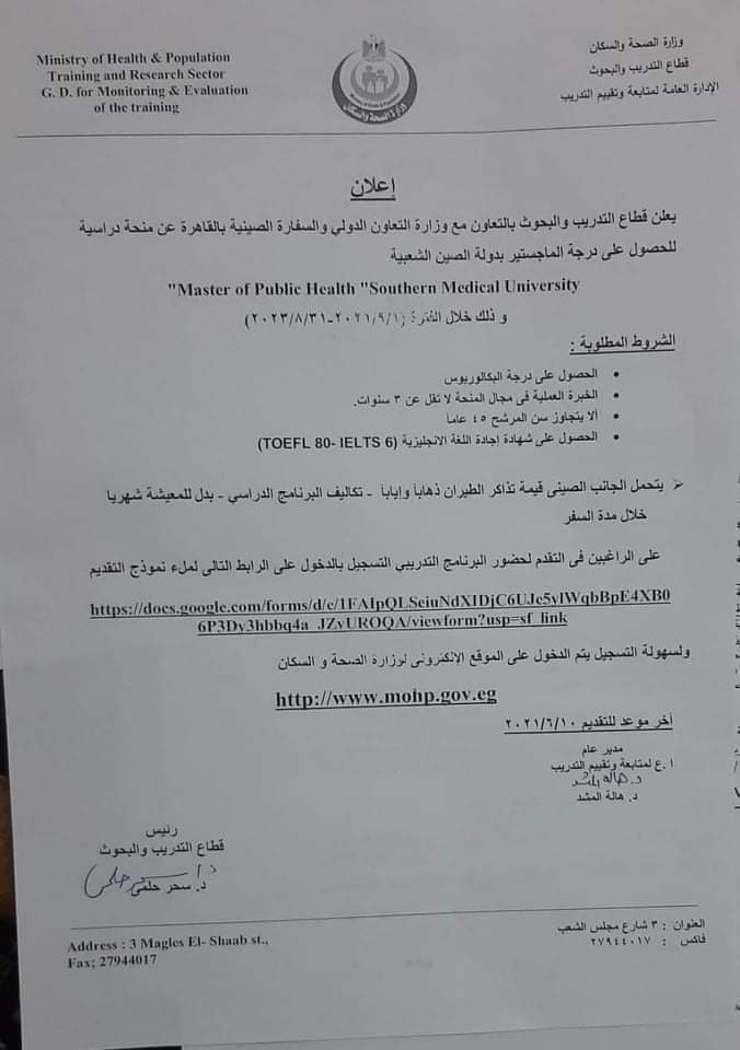 أعلن قطاع التدريب والبحوث، التابع لوزارة الصحة، بالتعاون مع وزارة التعاون الدولي والسفارة الصينية بالقاهرة عن منحة دراسية للحصول على درجة الماجستير بدولة الصين الشعبية.