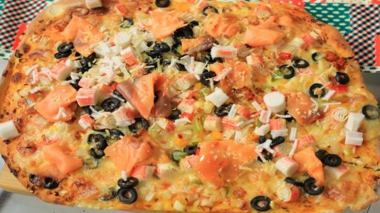 * يضاف القليل من الزعتر ثم تضاف والزيتون والبصل والفلفل والجبنة الموتزاريلا