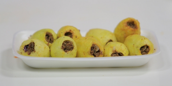 *اسكبي الخليط في طاجن ورصي فوقه حلقات البطاطس ثم شبت وبقدونس مفروم ثم صبي عليها مرقة