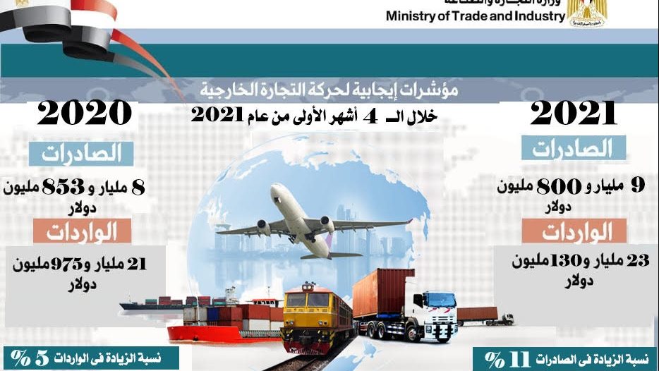 أعلنت نيفين جامع وزيرة التجارة والصناعة أن الصادرات المصرية غير البترولية حققت زيادة ملموسة بنسبة 11% خلال الـ 4 أشهر الأولي من عام 2021 حيث بلغت 9 مليارات و800 مليون دولار مقارنة بنحو 8 مليارات و853 مليون دولار خلال نفس الفترة من عام 2020.