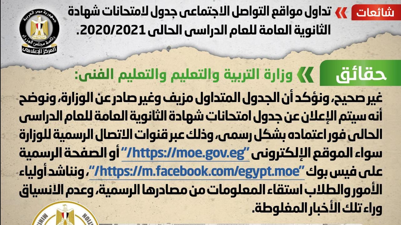 نفي المركز الاعلامي لمجلس الوزراء ما تداولت بعض صفحات التواصل الاجتماعي جدولاً لامتحانات شهادة الثانوية العامة للعام الدراسي الحالي 2020/2021، وقد قام المركز الإعلامي لمجلس الوزراء بالتواصل مع وزارة التربية والتعليم والتعليم الفني، والتي نفت تلك الأنباء، مُؤكدةً أنه لا صحة للجدول المتداول لامتحانات شهادة الثانوية العامة للعام الدراسي الحالي 2020/2021.