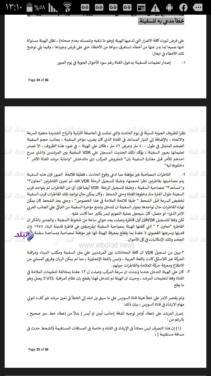 قالت مصادر قضائية، في تصريحات خاصة، ان هيئة دفاع ملاك السفينة ايفر جيفين، والذي يضم كلا من المحامي أشرف السويفي والدكتور حازم بركات، تقدموا بمذكرة ضمت تفريغا للصندوق الأسود للسفينة، كشفوا فيه ارتكاب مرشدي الهيئة بقناة السويس بعض الأخطاء والتي أثرت علي سلامة رحلتها البحرية بالمجري الملاحي وتسببت في حدوث واقعة الشحوط.