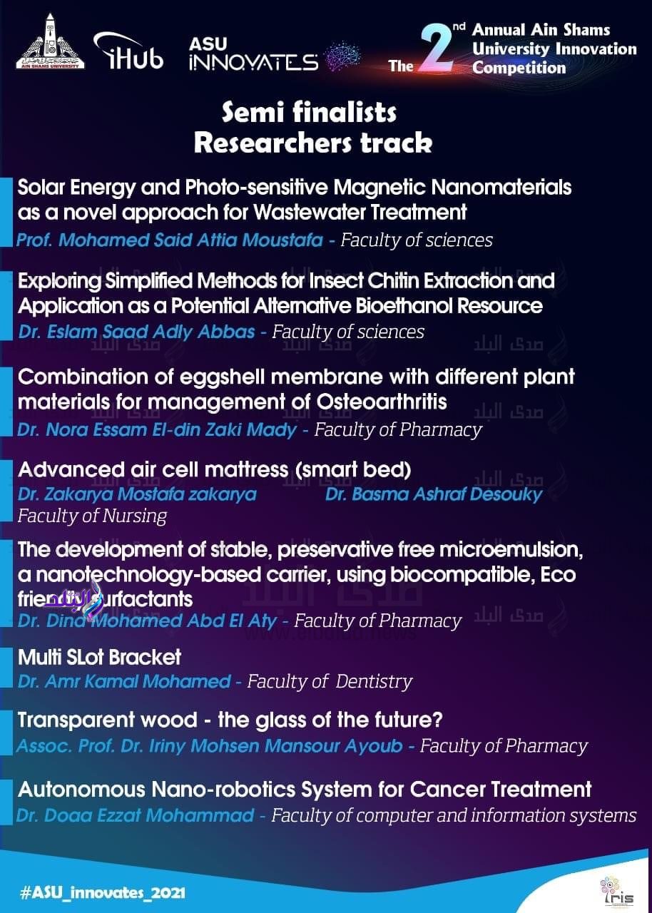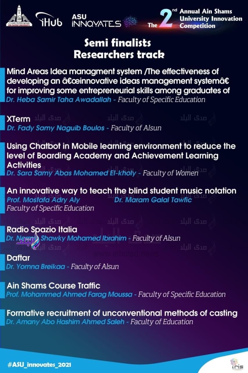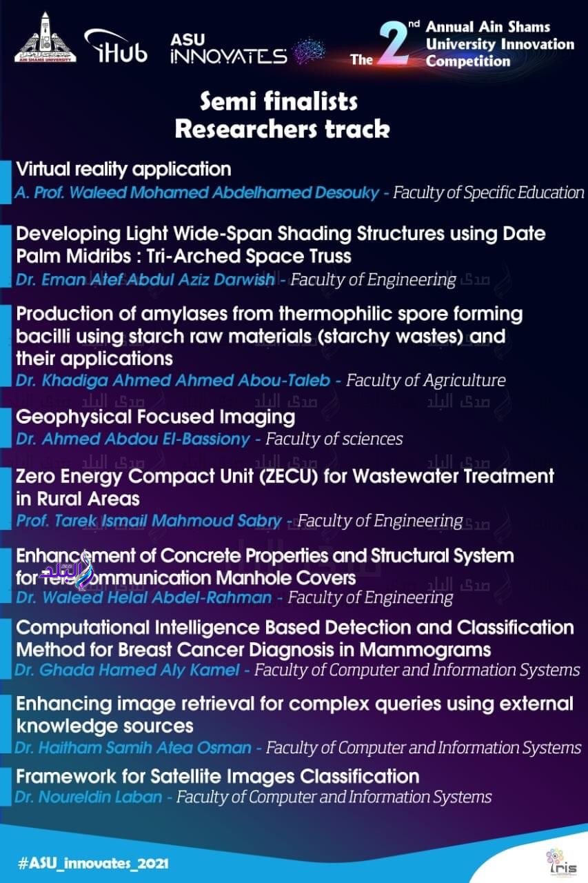 وفيما يلي ينشر موقع صدى البلد بالصور نتيجة المتأهلين للتصفيات النصف نهائية لمسابقة عين شمس تبتكر 2021 - مسار الباحثين.