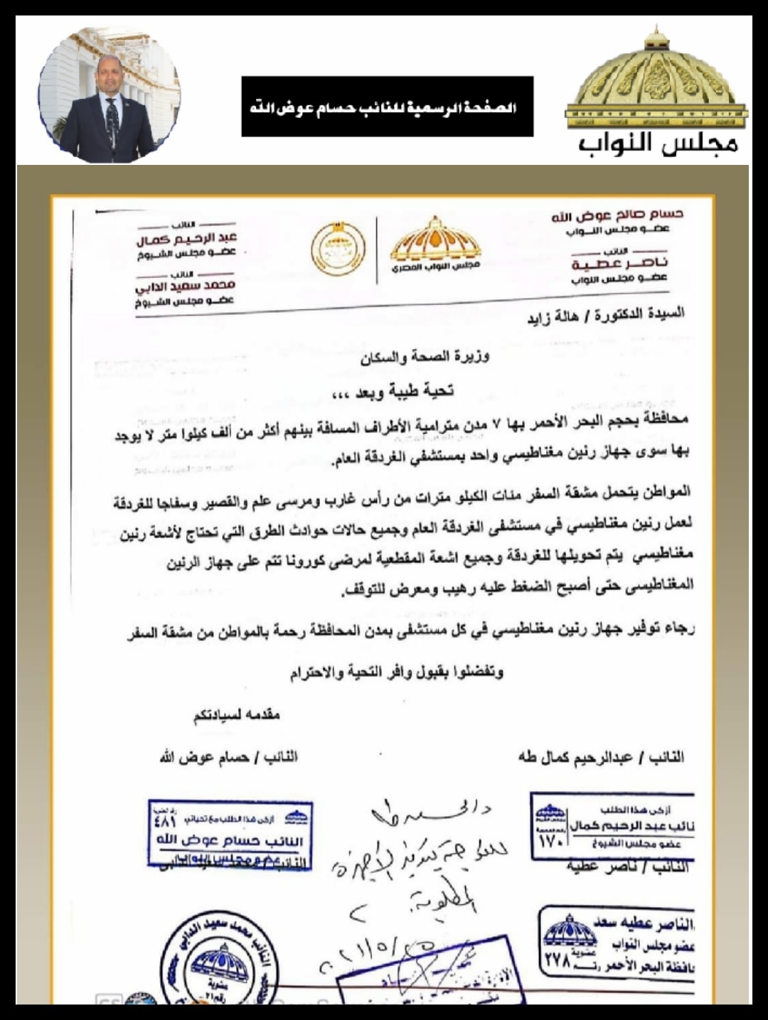 وتابع النواب، "المواطن يتحمل مشقة السفر مئات الكيلومترات من رأس غارب ومرسى علم والقصير وسفاجا للغردقة؛ لعمل أشعة رنين مغناطيسي في مستشفى الغردقة العام، وجميع حالات حوادث الطرق التي تحتاج لأشعة رئين مغناطيسي يتم تحويلها للغردقة وجميع أشعة المقطعية لمرضي كورونا تتم على جهاز الرنين المغناطيسي حتى أصبح الضغط عليه رهيب ومعرض للتوقف.