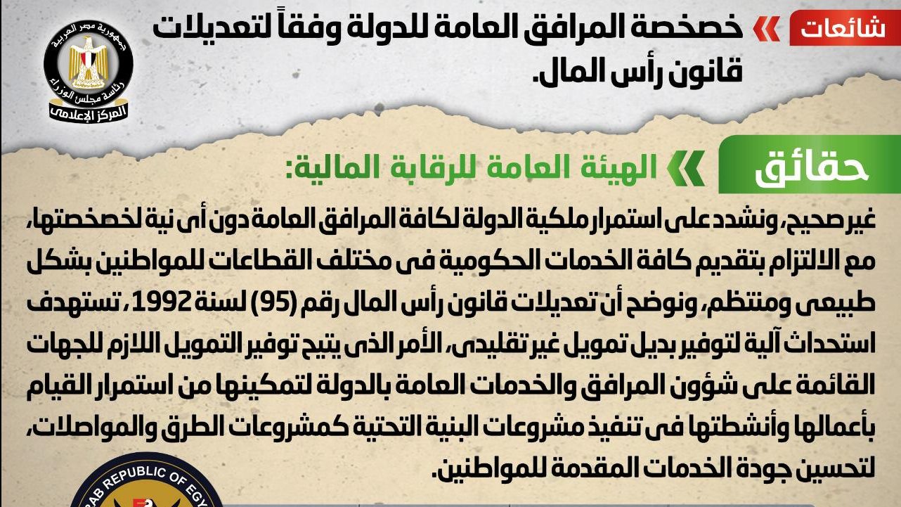 وشدد المركز الاعلامي لمجلس الوزراء على استمرار ملكية الدولة لكافة المرافق العامة دون أي نية لخصخصتها، مع الالتزام بتقديم كافة الخدمات الحكومية في مختلف القطاعات للمواطنين بشكل طبيعي ومنتظم، مُوضحةً أن تعديلات قانون رأس المال رقم (95) لسنة 1992، تستهدف استحداث آلية لتوفير بديل تمويل غير تقليدي، الأمر الذي يتيح توفير التمويل اللازم للجهات القائمة على شؤون المرافق والخدمات العامة بالدولة لتمكينها من استمرار القيام بأعمالها وأنشطتها في تنفيذ مشروعات البنية التحتية كمشروعات الطرق والمواصلات، لتحسين جودة الخدمات المقدمة للمواطنين.