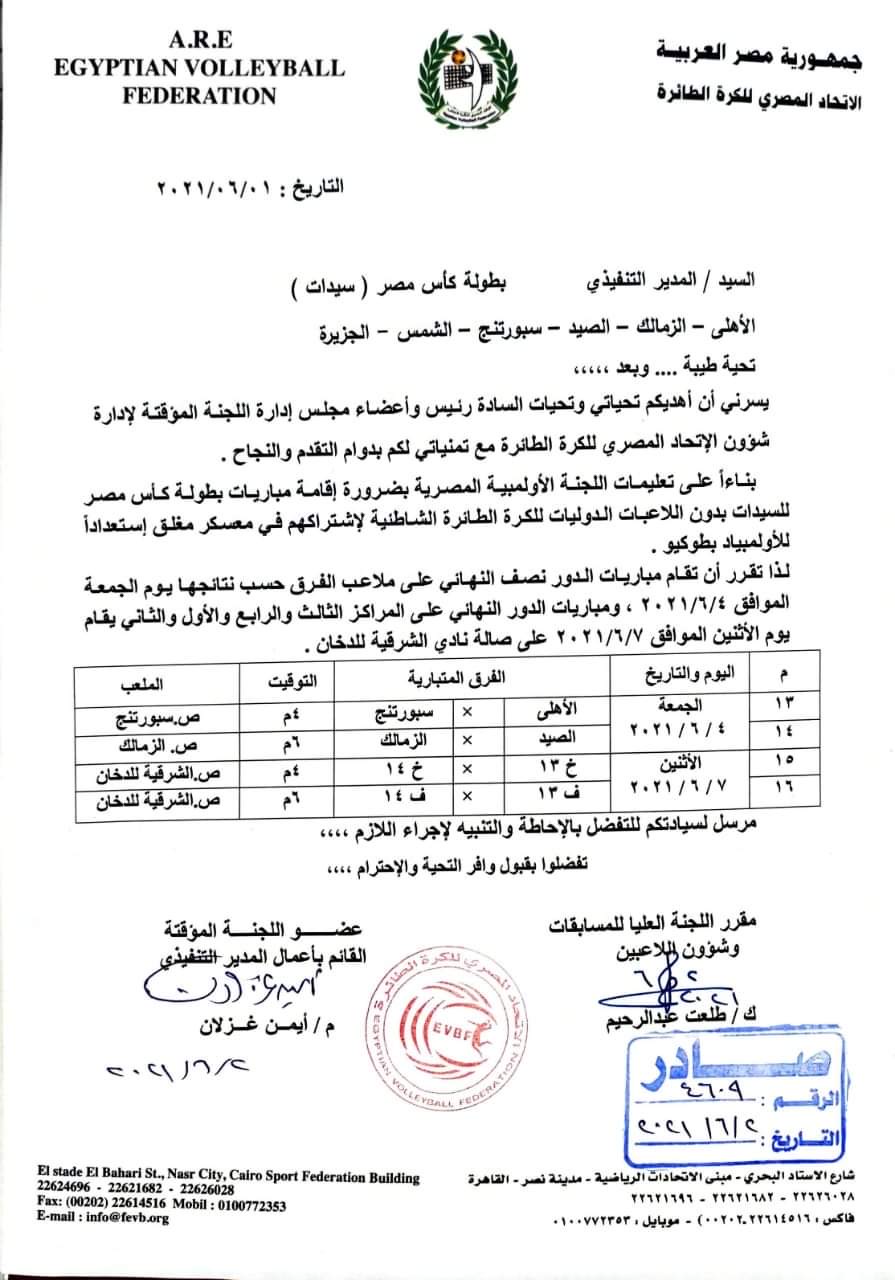 حددت لجنة المسابقات باتحاد الكرة الطائرة، برئاسة طلعت عبد الرحيم، يوم الإثنين المقبل موعدًا لإقامة المباراة النهائية ومباراة تحديد المركزين الثالث والرابع ببطولة كأس مصر للسيدات للموسم الحالي 2020 - 2021.