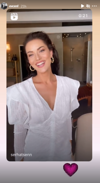 وظهرتفهرية أفجانمرتدية فستان طويل باللون الأبيض من الكتان بأكمام طويلة بقصة مميزة من منطقة الصدر، وهو ما أبرز أنوثتها.