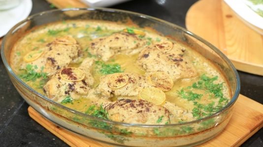 * في وعاء خارجي تخلط باقي المكونات مع بعضها، ثم تضاف مع الدجاج المحمر في وعاء بايركس وتدخل الفرن حتى يتحمر وجهها، وتزين بالسماق وشرائح الليمون، وتقدم ساخنة.