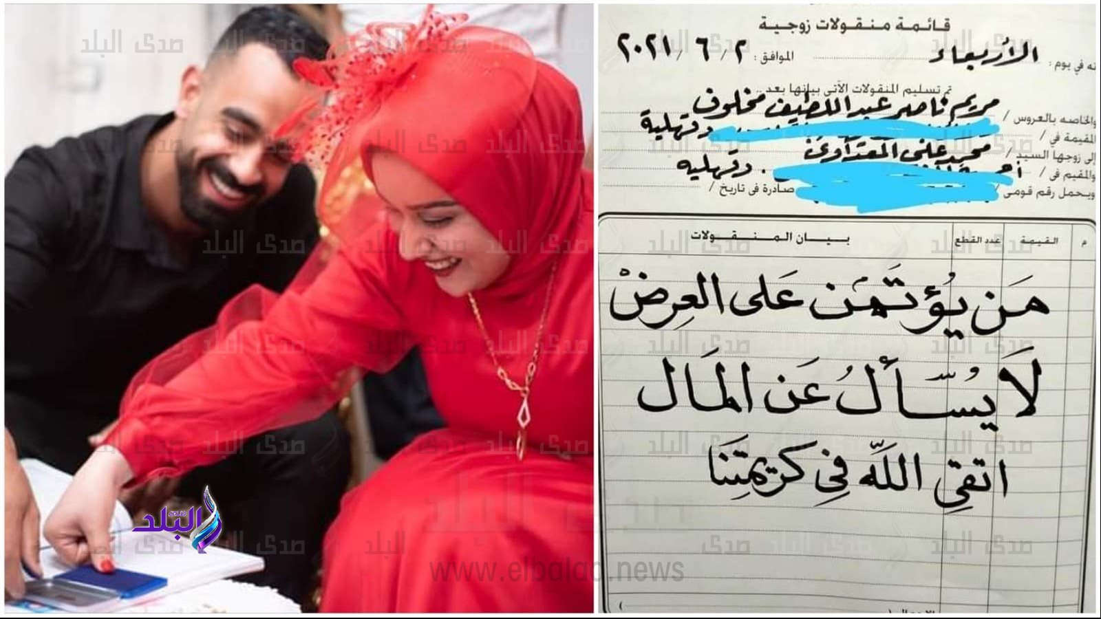 «من يؤتمن على العرض لا يسأل عن المال اتقى الله فى كريمتنا»، عبارة اكتفى ناصر عبد اللطيف، والد العروس مريم، في كتابة قائمة منقولات ابنته، ولاقت العبارة جدلاً عند البعض، وأصبحت حديث السوشيال ميديا.