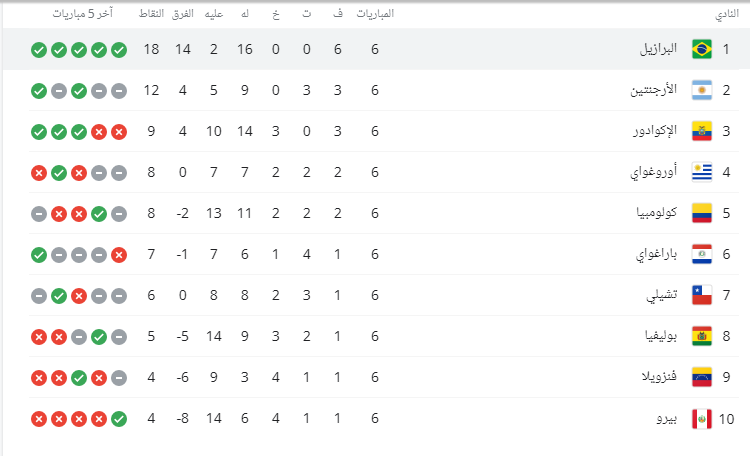 وارتفع رصيد منتخب البرازيل في صدارة جدول ترتيب تصفيات أمريكا الجنوبية المؤهلة لمونديال 2022، برصيد 18 نقطة، متفوقا بفارق 6 نقاط عن أقرب ملاحقيه منتخب الأرجنتين الوصيف برصيد 12 نقطة.