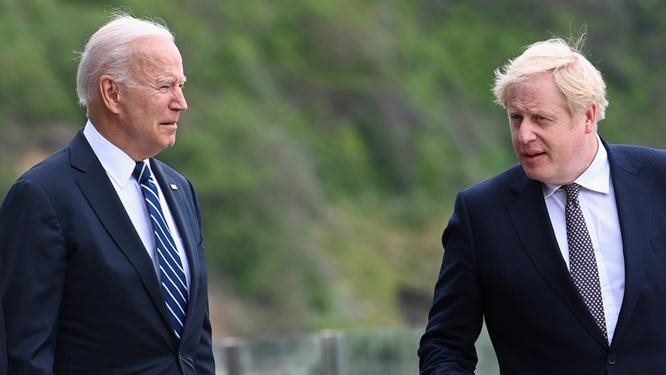 ظهر الرئيس الأمريكي جو بايدن مع رئيس الوزراء البريطاني بوريس جونسون، الخميس، برفقة زوجاتهم في منتزه على خليج كاربيس ببريطانيا.