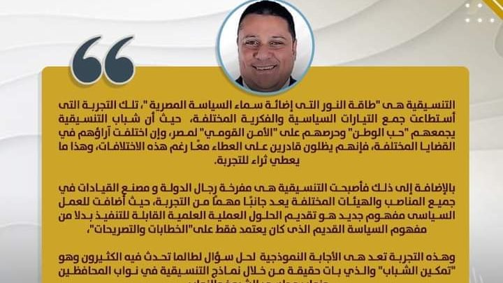 واستطرد: "لم تتوقف تجربتنا عند مرحلة الحوار ، وإنما تبعها مرحلة الاعتماد على جيل الشباب وجيل الوسط في تولي مسؤولياتهم الوطنية، فأصبح للتنسيقية 6 نواب للمحافظين، ثم 32 نائبا بمجلس النواب، و16 نائبا بمجلس الشيوخ، مع تمكين حقيقي للمرأة لتصل نسبة السيدات من نواب التنسيقية بمجلسي النواب والشيوخ إلى نسبة تقترب من نصف مقاعد التنسيقية في المجلسين".