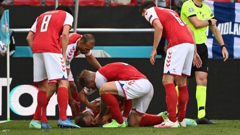 وسقط كريستيان إريكسن على أرضية أرضية الملعب، في الدقيقة 42 إثر تعرضه من أزمة قلبية.