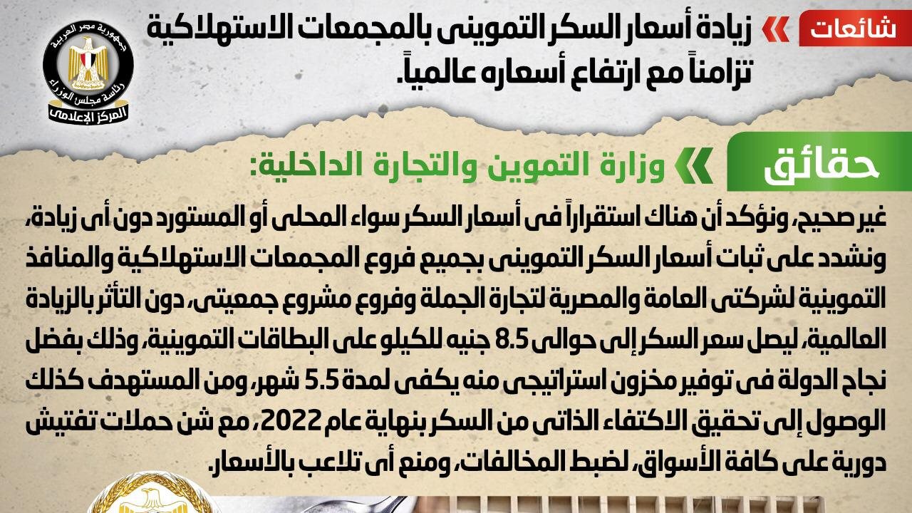 وقال المركز الإعلامي لمجلس الوزراء، في بيان له اليوم، أنه بالتواصل مع وزارة التموين والتجارة الداخلية، التي نفت تلك الأنباء، مُؤكدةً أنه لا صحة لزيادة أسعار السكر التمويني بالمجمعات الاستهلاكية بعد ارتفاع أسعاره عالميًا، وأن هناك استقرارًا في أسعار السكر سواء المحلي أو المستورد دون أي زيادة.