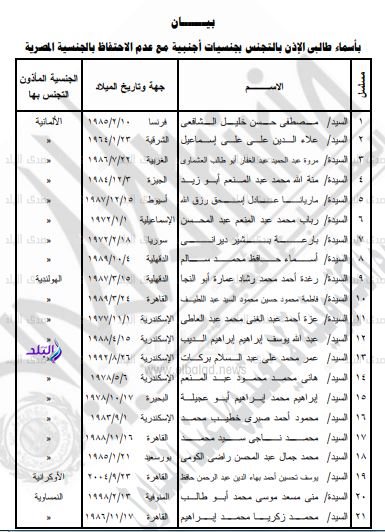 وتضمن قرار وزير الداخلية الأذن لكل من الواحد والعشرين مواطنا المدرجة أسماؤهم بالبيان التالي بالتجنس بالجنسية الأجنبية الموضحة قرين اسم كل منهم، مع عدم احتفاظهم بالجنسية المصرية.