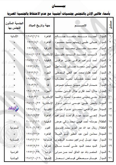 وتضمن قرار وزير الداخلية الأذن لكل من الواحد والعشرين مواطنا المدرجة أسماؤهم بالبيان التالي بالتجنس بالجنسية الأجنبية الموضحة قرين اسم كل منهم، مع عدم احتفاظهم بالجنسية المصرية.