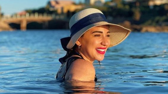 وظهرت اسما شريف منير في الصورة وهى وسط البحر خلال قضائها العطلة الصيفية بالجونة .