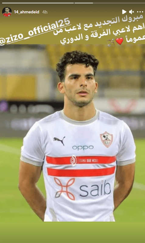 ونشر احمد عيد صورة لـ زيزو عبر خاصية استورى بموقع التواصل الاجتماعى “ انستجرام ” وكتب : مبروك التجديد مع لاعب من اهم لاعبى الفرقة والدوري عموما ".