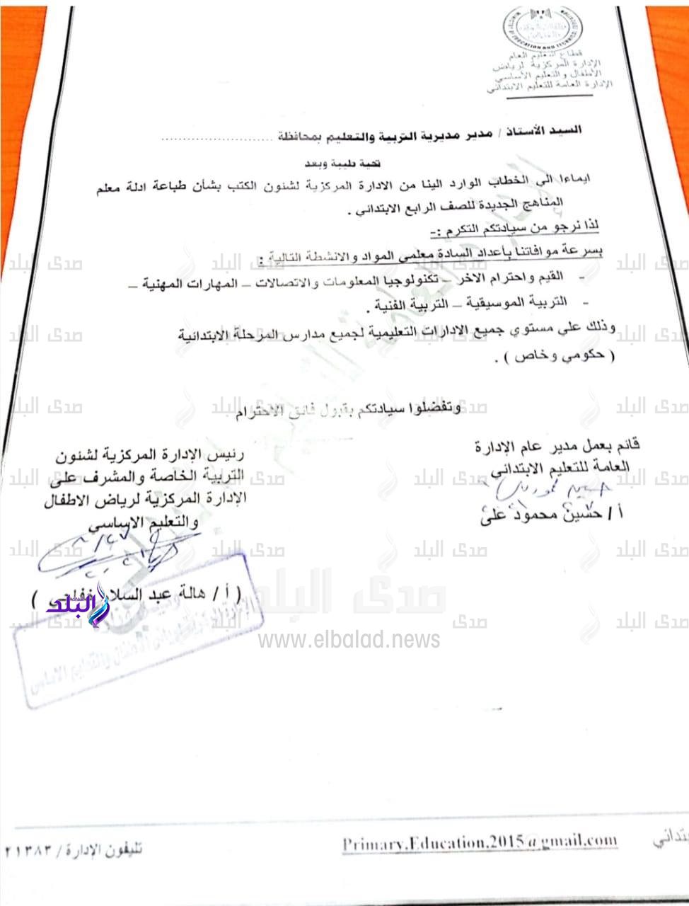 وفي هذا الإطار، أصدرت وزارة التربية والتعليم والتعليم الفني، تعليمات رسمية للمديريات التعليمية ، بسرعة موافاة الوزارة بأعداد معلمي مواد (القيم واحترام الآخر - تكنولوجيا المعلومات والاتصالات - المهارات المهنية - التربية الموسيقية - التربية الفنية ) ، وذلك على مستوى جميع الادارات التعليمية لجميع مدارس المرحلة الابتدائية (حكومي وخاص) ، لطباعة الاعداد المطلوبة من ادلة المعلم.