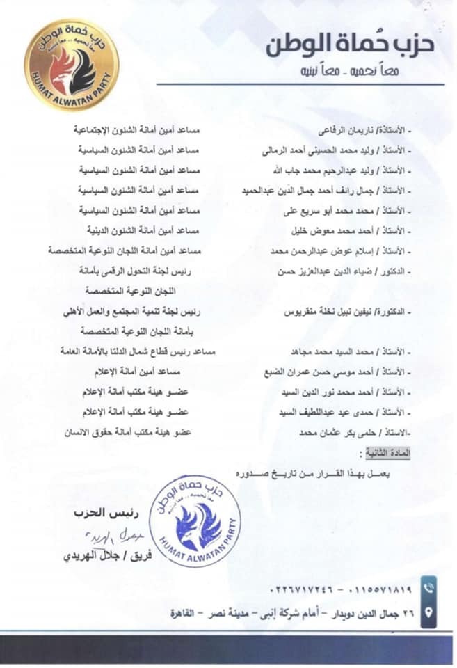جاء قرار رئيس حزب حماة الوطن الفريق جلال الهريدي، بعد الإطلاع على لائحة النظام الأساسي للحزب وتقرير أمانة التنظيم وعرض الأمين العام.