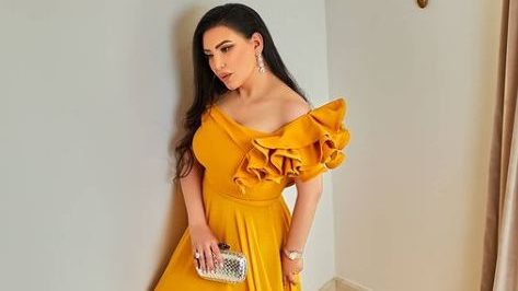 وظهرت عبير صبرى في الصورة وهي ترتدي فستان سوارية أصفر ، وشعرها المنسدل علي الاكتاف .