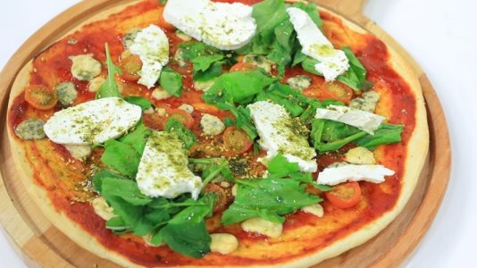 غطي العجينة إلى أن تختمر وقسّمى العجينة إلى قسمين. افرد كل قطعة من العجينة بحذر وزعي صلصة الطماطم فوق البيتزا وضعي فوقها شرائح الموتزاريلا والريحان.تخبز البيتزا لمدة 10 دقائق حتى يذوب الجبن