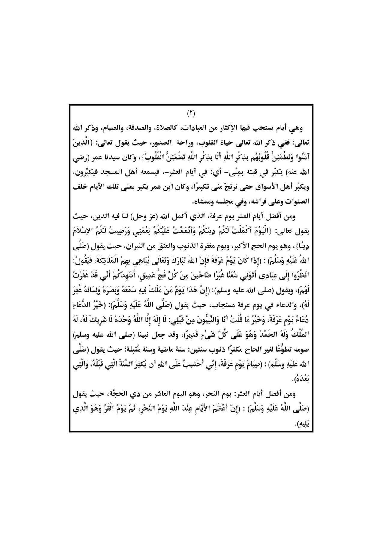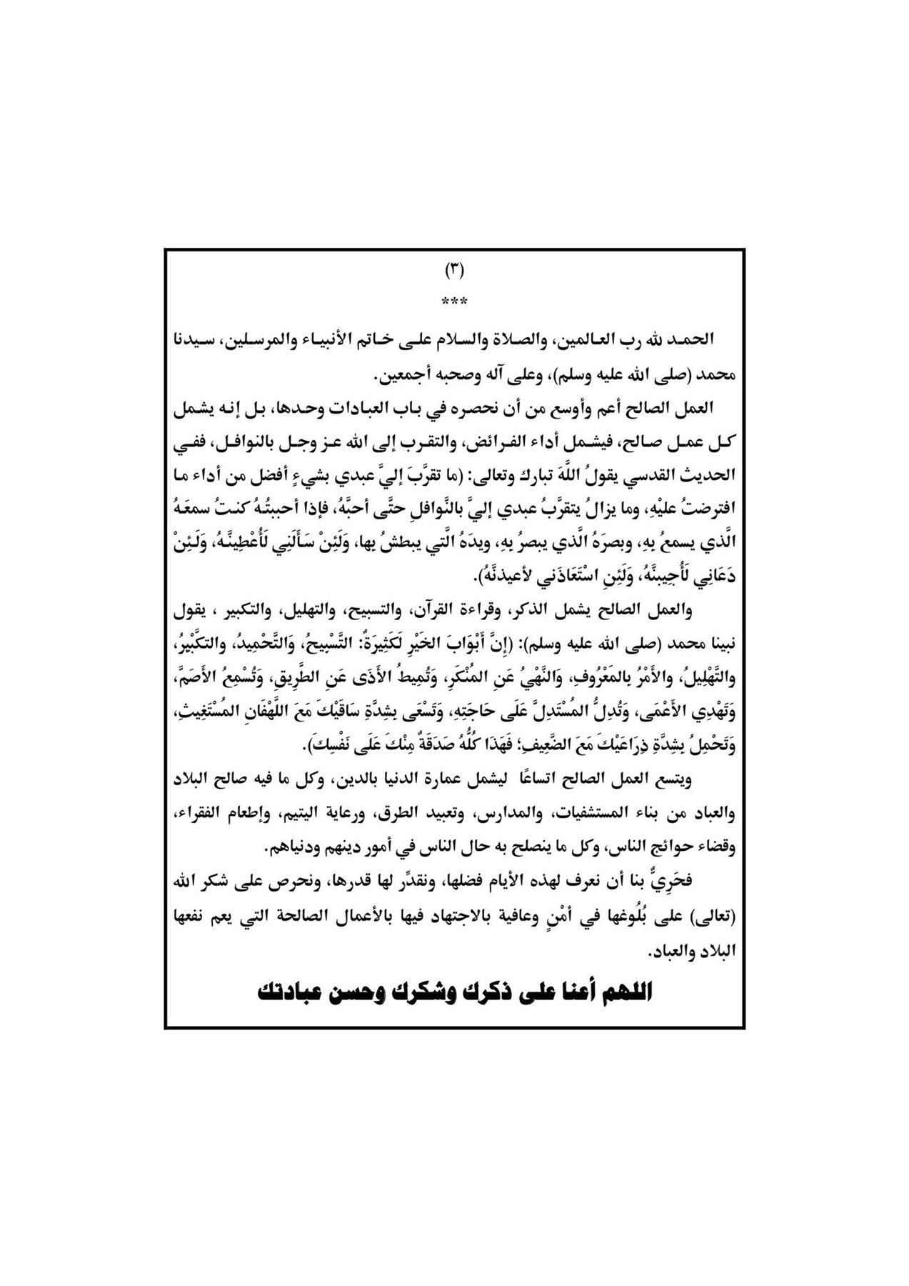 نشر وزير الأوقاف الدكتور محمد مختار جمعة نص موضوع خطبة الجمعة القادمة عبر صفحته الرسمية بالفيسبوك ، تحت عنوان "فضائل العشر ومفهوم العمل الصالح " ، مع التأكيد على جميع الأئمة الالتزام بموضوع الخطبة نصا أو مضمونا على أقل تقدير، وألا يزيد أداء الخطبة عن عشر دقائق للخطبتين الأولى والثانية مراعاة للظروف الراهنة، مع ثقتنا في سعة أفقهم العلمي والفكري، وتفهمهم لما تقتضيه طبيعة المرحلة.