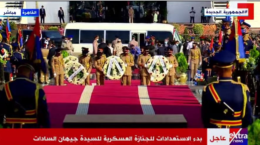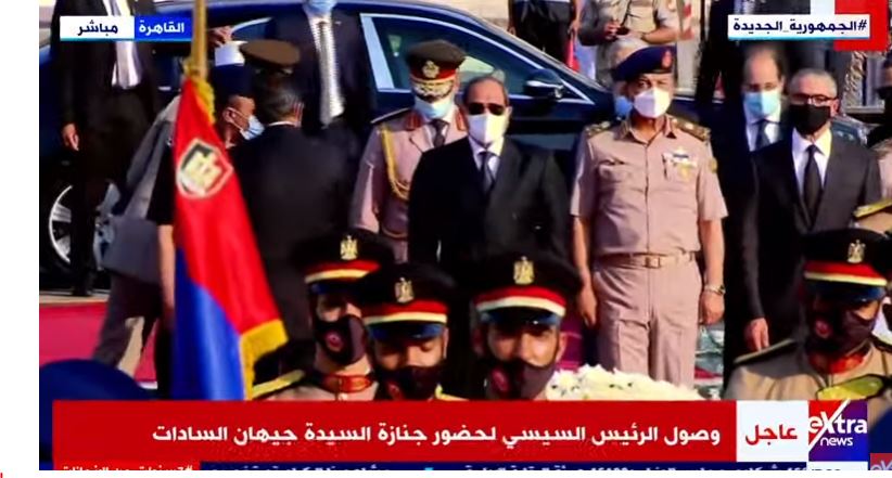 ووقف الرئيس عبد الفتاح السيسي، أمام قبر الرئيس الراحل أنور السادات وزوجته، وقرأ الفاتحة، وذلك عقب مشاركته في الجنازة العسكرية للراحلة جيهان السادات، وتقديم واجب العزاء لأهل الراحلة.