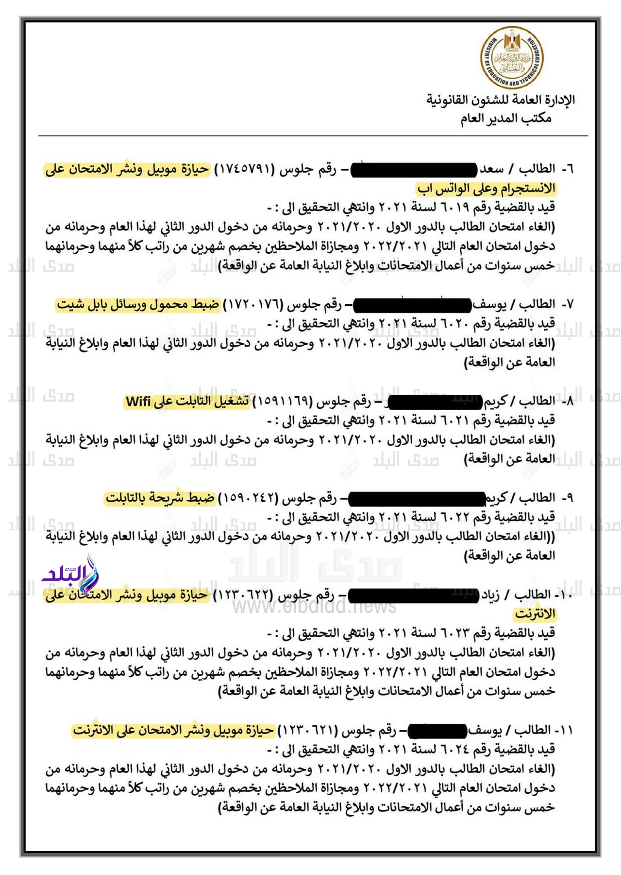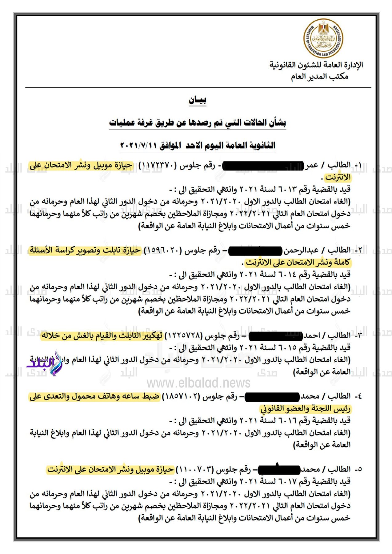 - الطالب "م.ج.ش" بإدارة الحوامدية بمحافظة الجيزة نظرًا لحيازته جهاز محمول ونشر الامتحان على الإنترنت.