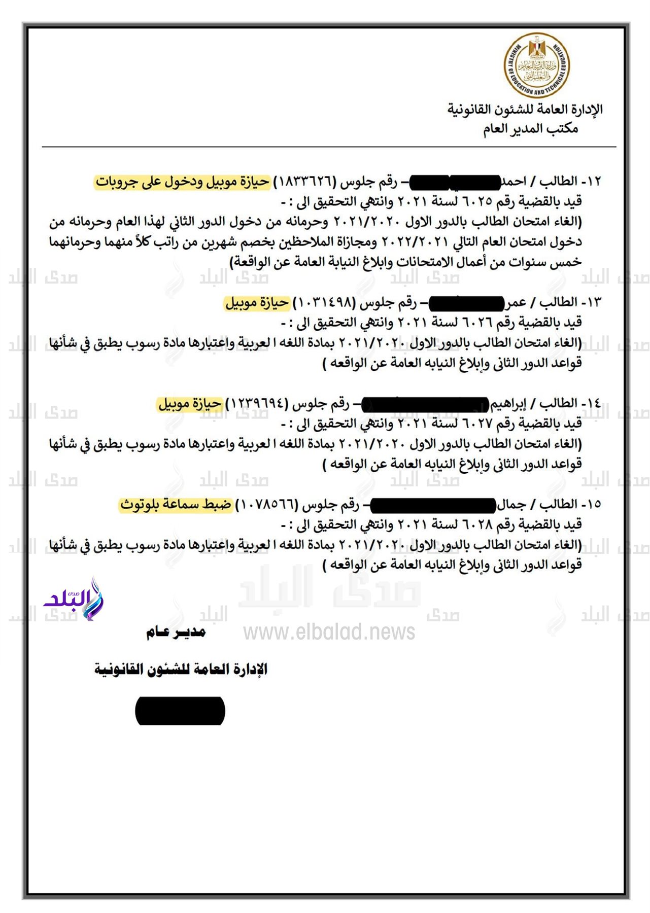 - الطالب "ع. م.ف" بإدارة أكتوبر بمحافظة الجيزة نظرًا لحيازته جهاز محمول واستخدامه في الغش.
