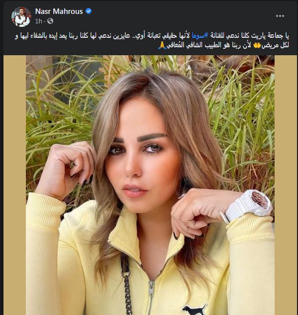 نشر المنتج نصر محروس صورة للفنانة سوما على حسابه بموقع فيسبوك، وطلب من الجمهور الدعاء لها بعد مرورها بأزمة صحية دخلت على إثرها المستشفى.
