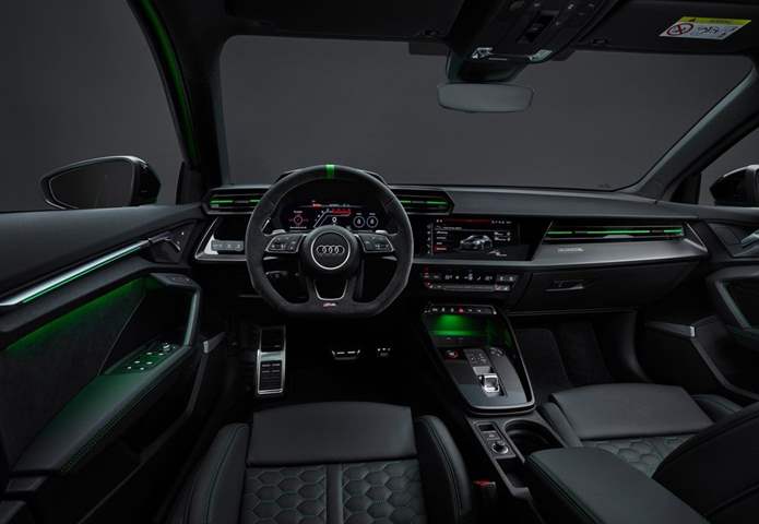 و تحتوي السيارة اوديRS3 موديل 2022 الجديدة على مقصورة داخلية تتسم بالطابع الرياضي، حيث تشمل عجلة قيادة مالتي فانكشن متعددة المهام، ولوحة العدادات مصنوعة من ألياف الكربون مع شاشة على الزجاج الامامي لعرض المعلومات، بالإضافة إلى مقاعدRS الرياضية، إلى جانب خيار اخر يعتمد على جلد نابا الفاخر، كما تتوسط قمر القيادة شاشة ملونة تعمل باللمس لعرض الوسائط المتعددة و أنظمة الملاحة يبلغ قياسها 12.3 بوصة.