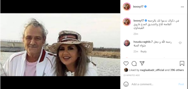 وعلقت بوسى شلبى على صوورة تجمعها بالفنان فاروق الفيشاوى قائلة : " في ذكراك ندعوا لك بالرحمة الفاتحة للأخ والصديق الجدع فاروق الفيشاوي”.