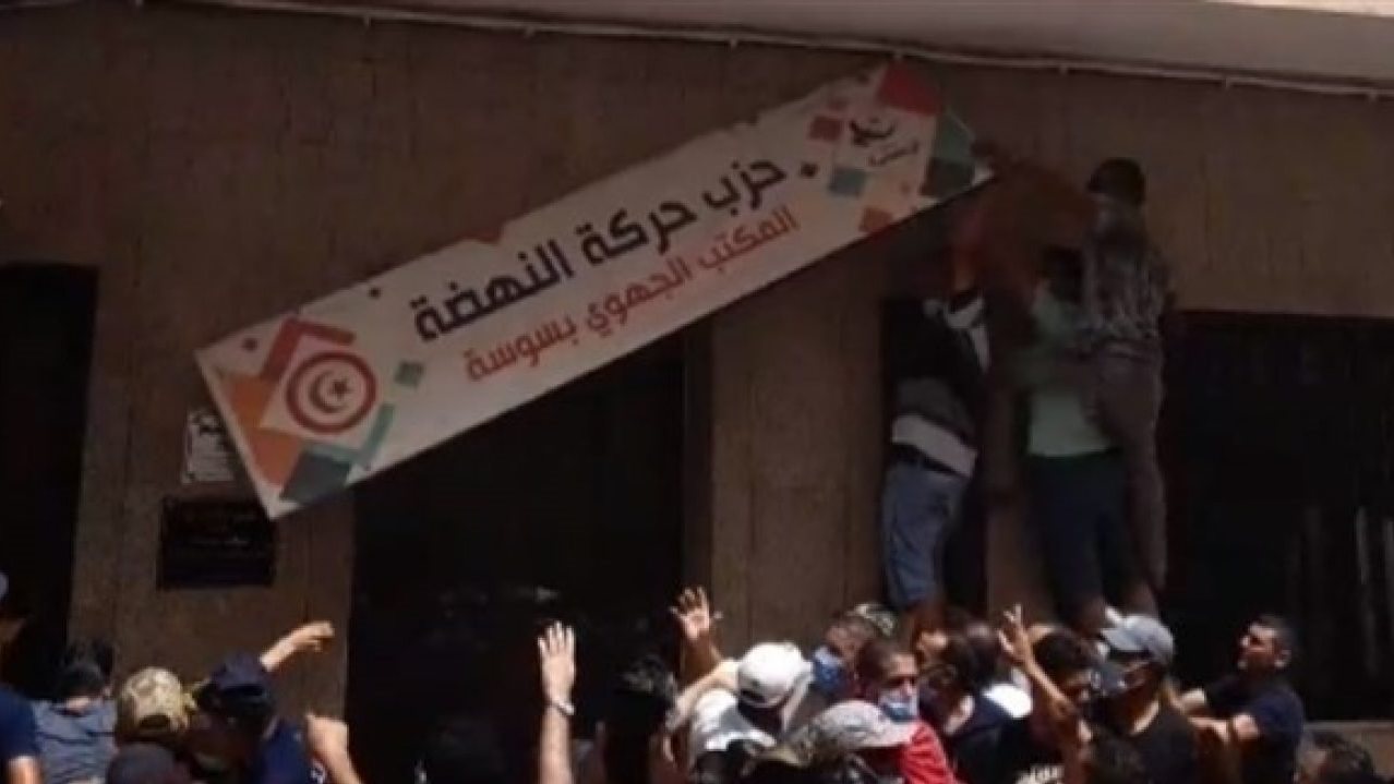 وسرعان ما اقتحم عدد من المحتجين التونسيين مقر حركة النهضة الإخوانية في محافظة توزر الجنوبية، وقاموا بحرقه وخلع ملابس عدد من قيادات النهضة وطردهم.