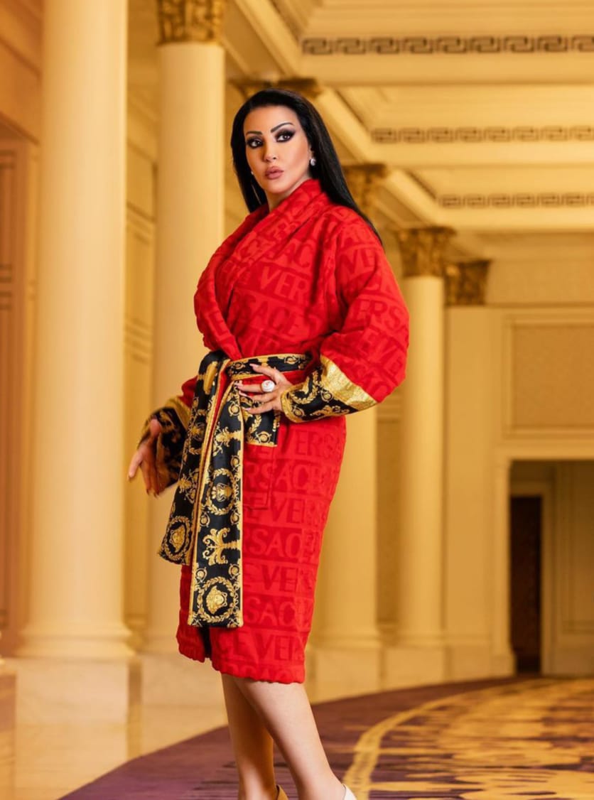 وظهرت سمية الخشاب باطلالة جريئة مرتدية روب مميز باللون الأحمر ووضعت مكياج صاخب، وروج باللون الأحمر، وحددت عيونها باللون الأسود، وعلقت “أعظم رصيد للمرأة هو جمالها”.