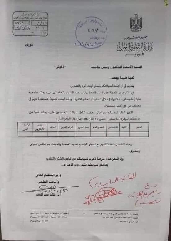 وكانت قد شهدت مواقع التواصل الاجتماعي ، تداول كبير من رواد هذه الموقع لخطاب موجه من وزارة التعليم العالي والبحث العلمي يطالب بحصر حاملي الشهادات العلمية البحثية ماجستير ودكتوراه والذي لم تؤكد الوزارة صحته حتى الأن ، والذي جاء كالتالي: "في إطار حرص الدولة على إنشاء قاعدة بيانات تضم الشباب الحاصلين على درجات جامعية عليا ماجستير و دكتوراة خلال السنوات العشرة الأخيرة وذلك لبحث كيفية الاستفادة منهم في مختلف مواقع العمل مستقبلا ".