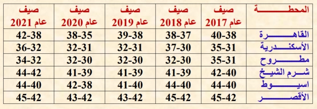 ونشرت هيئة الأرصاد الجوية، جدولا توضيحياً لمعدل درجات الحرارة التي شهدتها البلاد، على مدار الـ 5 أعوام الأخيرة منذ عام 2021، وجاء كالتالي: