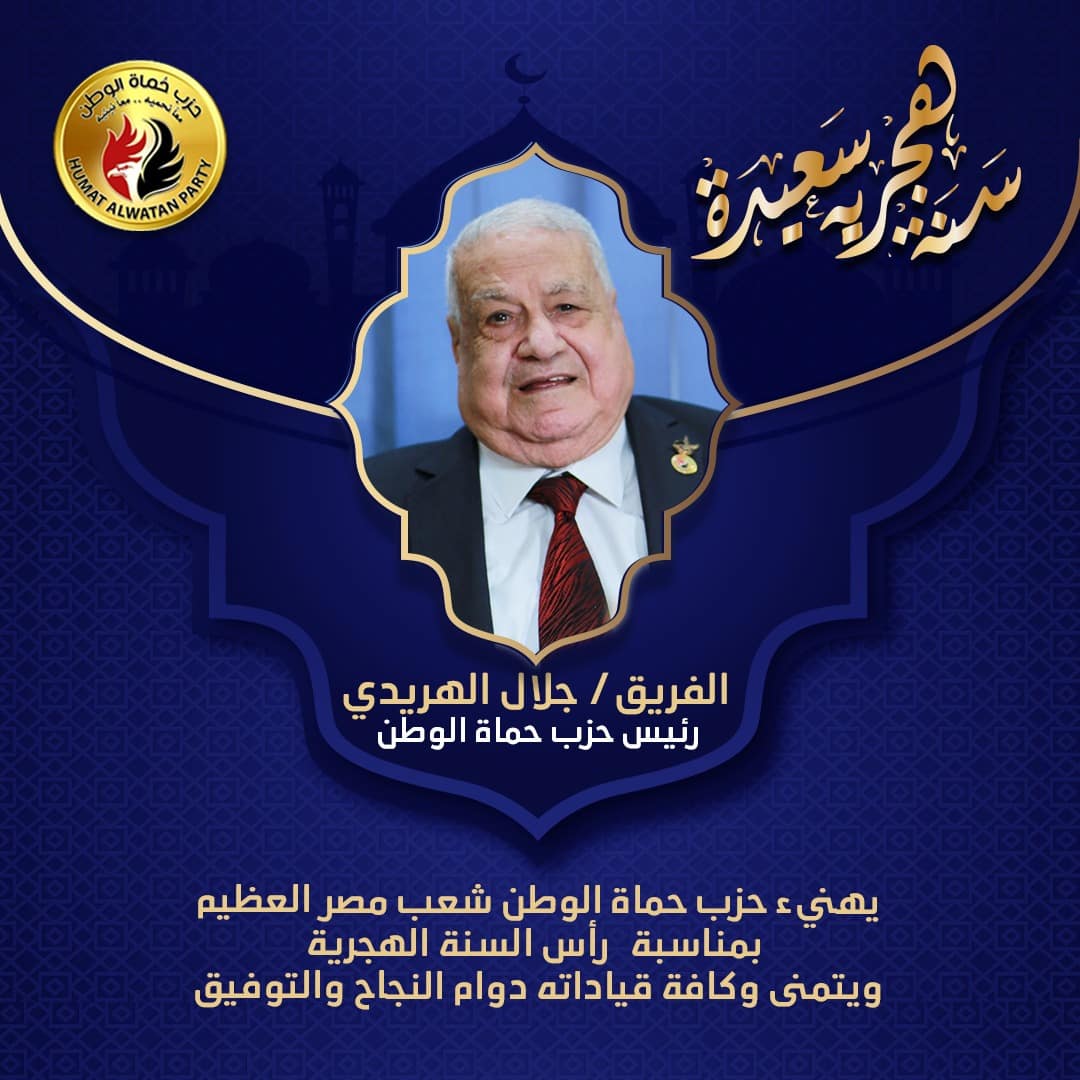 وتوجه رئيس حزب حماة الوطن الفريق جلال الهريدي بالدعاء إلي المولي عز وجل أن يكون هذا العام الجديد عام سعيد يملؤه الخير والبركات علي شعب مصر العظيم، وان يحيا الوطن في سلام ورخاء وأمن وأمان، ليكون في طليعة دول العالم، ونحن علي اعتاب الجمهورية الجديدة.. وفق الله مصرنا لما فيه الخير لها ولشعبها.