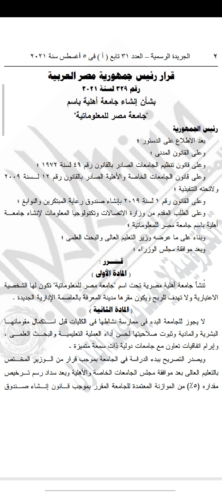 أصدر الرئيس عبد الفتاح السيسي القرار الجمهوري رقم ٣٢٩ لسنة ٢٠٢١ بشأن إنشاء جامعة أهلية باسم جامعة مصر للمعلوماتية تكون لها الشخصية الاعتبارية ولا تهدف للربح ويكون مقرها مدينة المعرفة بالعاصمة الإدارية الجديدة.