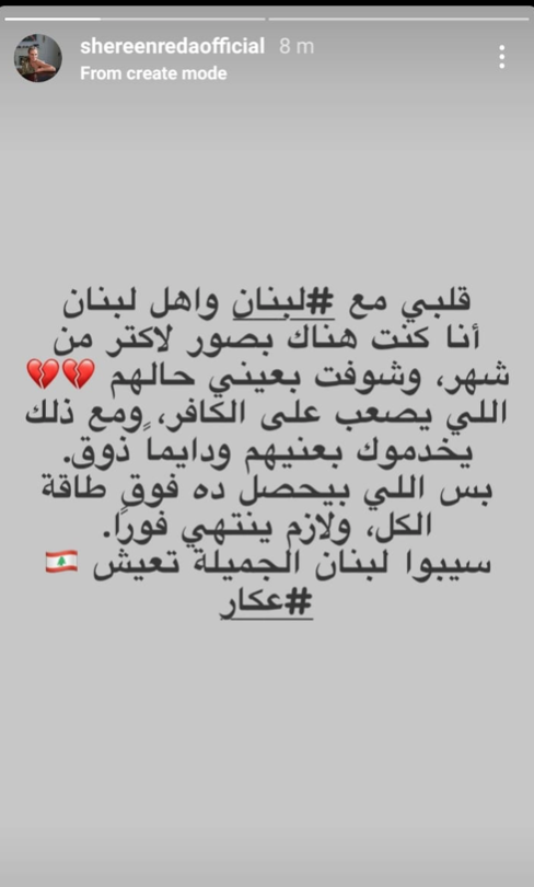 وكتبت شيرين رضا: “قلبي مع لبنان وأهل لبنان، أنا كنت هناك بصور لأكتر من شهر، وشوفت بعيني حالهم اللي يصعب على الكافر، ومع ذلك يخدموك بعنيهم ودايما ذوق، بس اللي بيحصل ده فوق طاقة الكل ولازم ينتهي فورا. سيبوا لبنان الجميلة تعيش”.