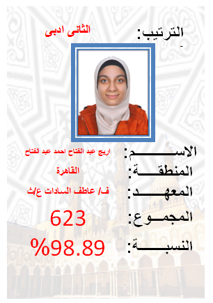 أعربت الطالبة أريج عبد الفتاح أحمد عبدالفتاح من أوائل الثانوية الازهرية فى القسم الادبي بمعهد عاطف السادات بمنطقة الزيتون عن سعادتها؛ لحصولها على مجموع 98.89 % المركز الثاني على الجمهورية.