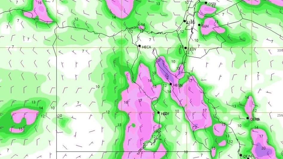 وبالنسبة لحالة البحرالمتوسط فتكون خفيفة إلى معتدلة وارتفاع الموج فيه من متر إلى 1.75 متر والرياح السطحية شمالية غربية، وحالة البحرالأحمر تكون معتدلة إلى مضطربة وارتفاع الموج فيه من مترين إلى 2.5 متر والرياح السطحية شمالية غربية.
