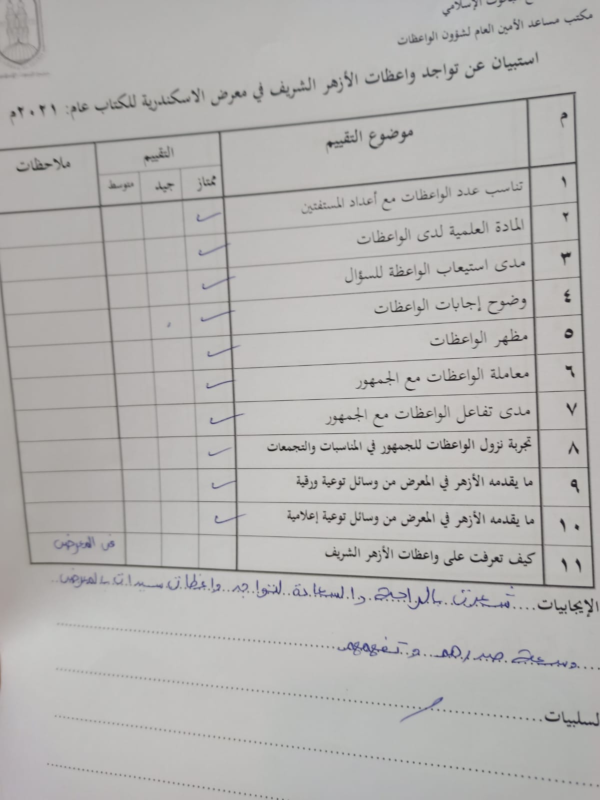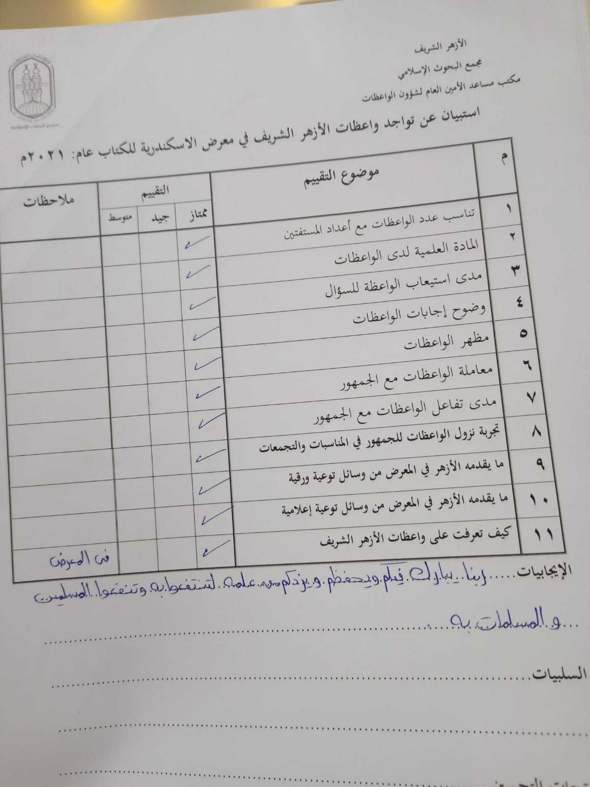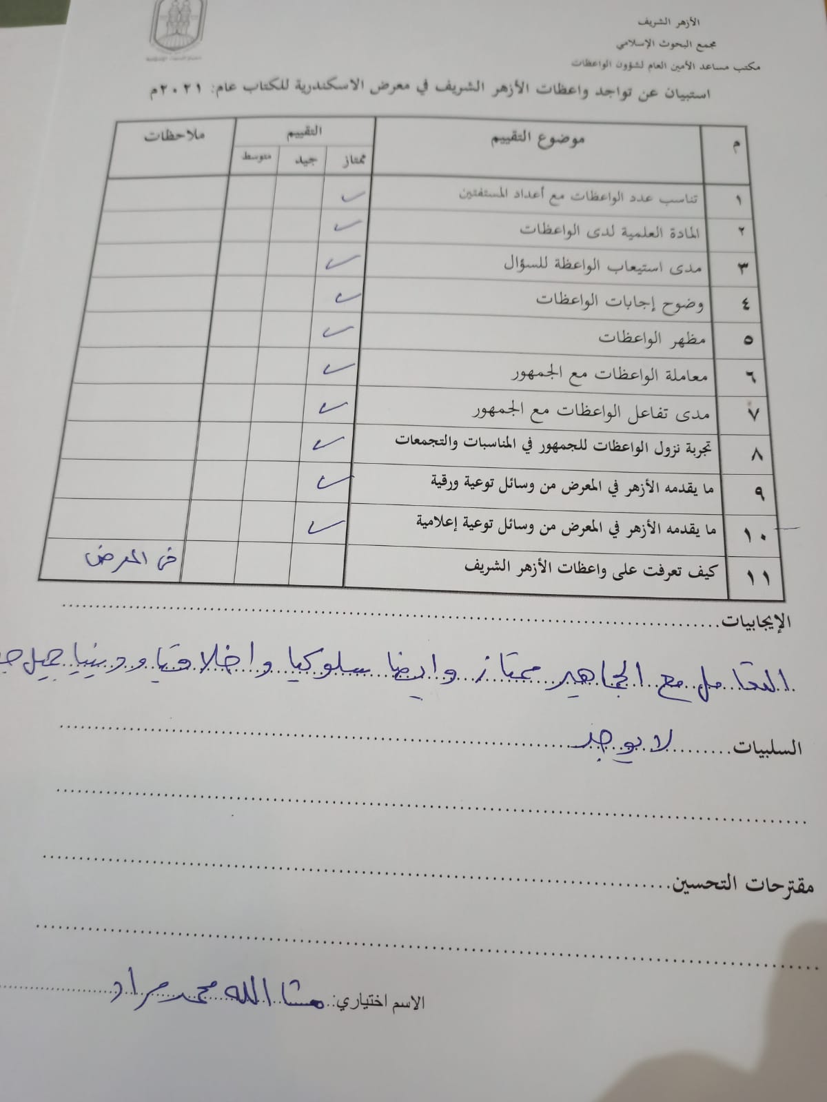 فيما قالت الواعظة نجوى شبل منطقة وعظ الإسكندرية: «حرصًا من الأزهر على معرفة رأي الجمهور في وجود الواعظات بركن الفتوى تم توزيع استبيان على المستفتين، وكانت النتائج لليوم الأول والثاني للاستبيانات الترحيب الكبير بالفكرة، وأعربوا عن سعادتهم بذلك وخاصة بعد توزيع مجلة واعظات الأزهر علي المستفتيات».
